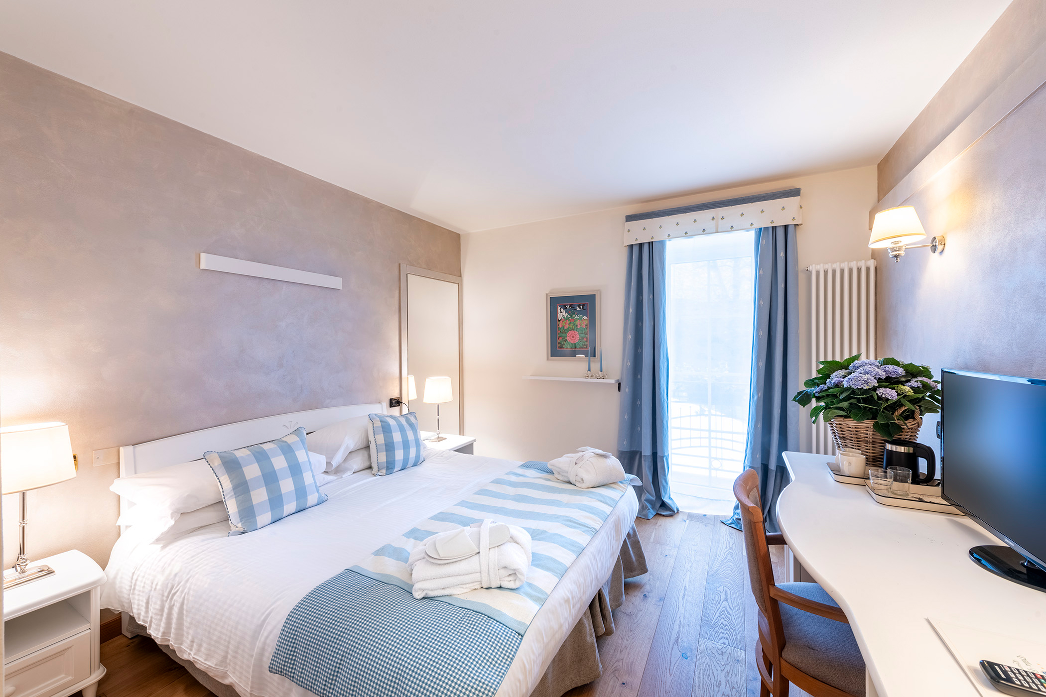 Le camere doppie superior 102 e 103 hanno rispettivamente 22 e 24 mq e possono ospitare una culla, sono appena state rinnovate e hanno il pavimento in rovere e il bagno con doccia e finestra. Le camere hanno un balcone con vista sul campo da golf e un piccolo salottino con due poltroncine.