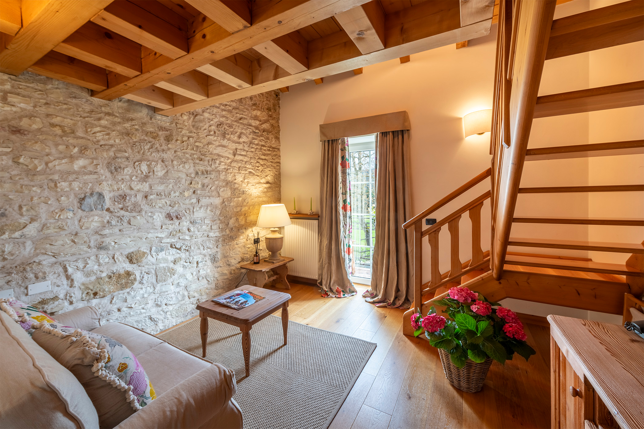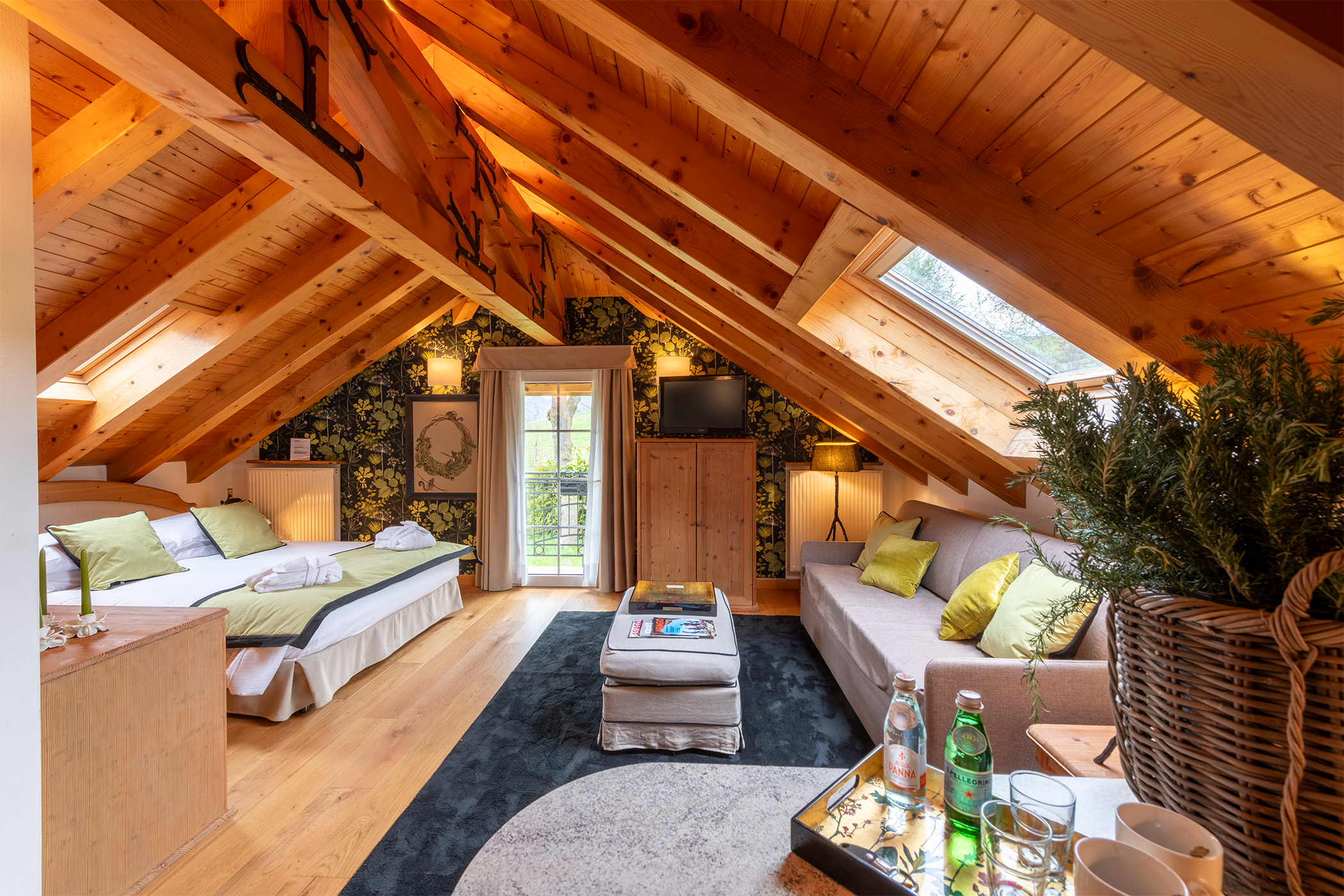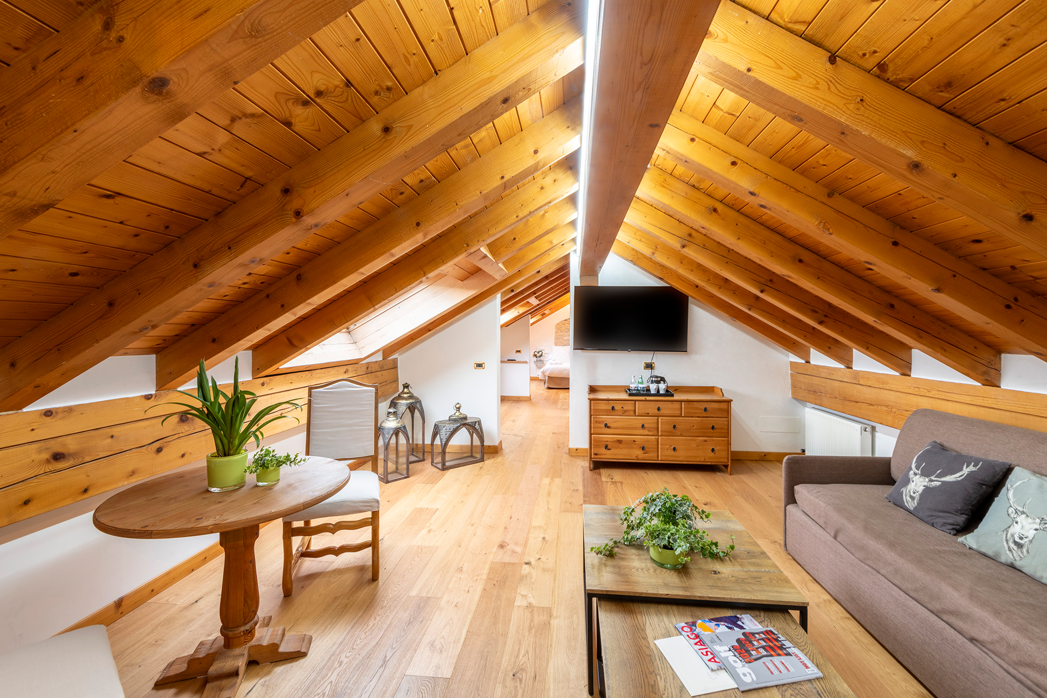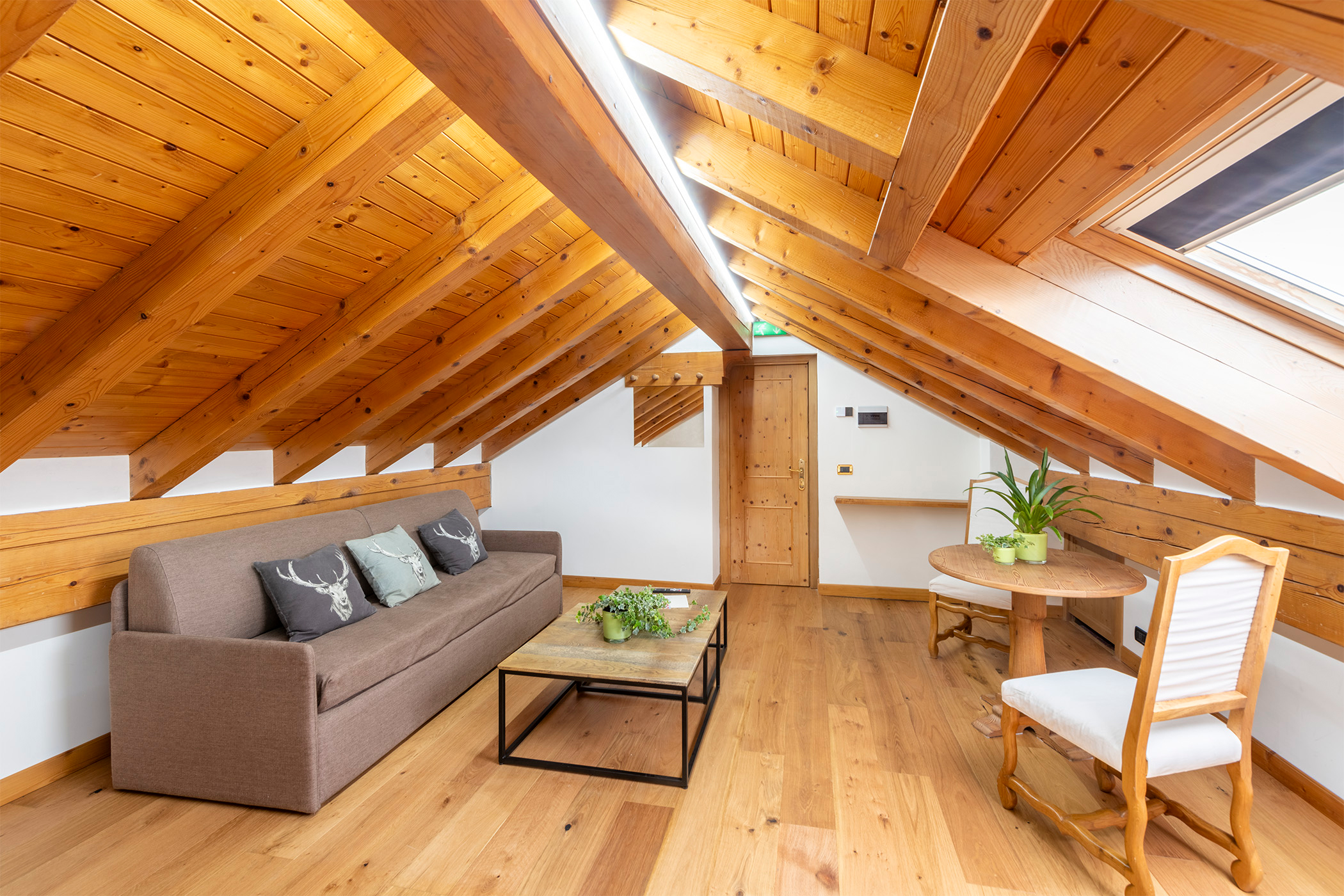 La Suite 111 ha 48 mq e può ospitare fino a 5 persone, è composto da una zona notte con un letto matrimoniale e una zona giorno con angolo cottura e un divano letto (sommier) a cui si può aggiungere un ulteriore letto. Il bagno è con doccia. L’appartamento è caratterizzato dal soffitto in legno d’abete che crea un ambiente caldo e accogliente. Particolarmente adatto a famiglie.